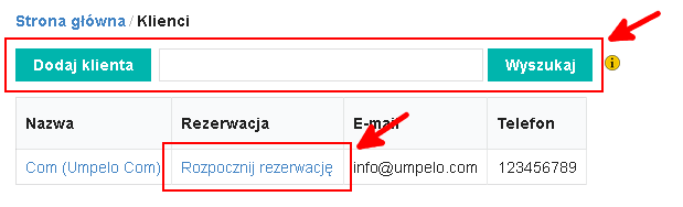 W pierwszym kroku jest nam potrzebny Klient. Możemy skorzystać z wyszukiwarki lub wybrać przycisk Dodaj klienta. Po zapisaniu nowego klienta lub skorzystaniu z wyszukiwarki wybieramy odnośnik Rozpocznij rezerwację znajdujący się obok nazwy klienta.