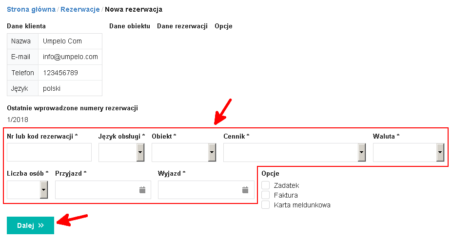 Po wybraniu Rozpocznij rezerwację należy uzupełnić przynajmniej wymagane pola (tj. nr lub kod rezerwacji, język obsługi, obiekt, cennik, waluta, liczba osób, data przyjazdu i data wyjazdu) i wybrać przycisk Dalej.