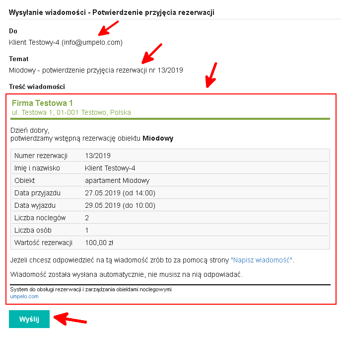 Jeżeli chcemy do klienta wysłać wiadomość potwierdzającą rezerwację wybieramy przycisk Przyjęcie rezerwacji.
