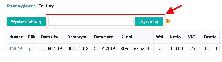 Wybieramy z menu systemowego zakładkę Faktury, wyszukiwarka faktur znajduje się nad tabelką z listą faktur. Po wpisaniu szukanej frazy wybieramy przycisk Wyszukaj.